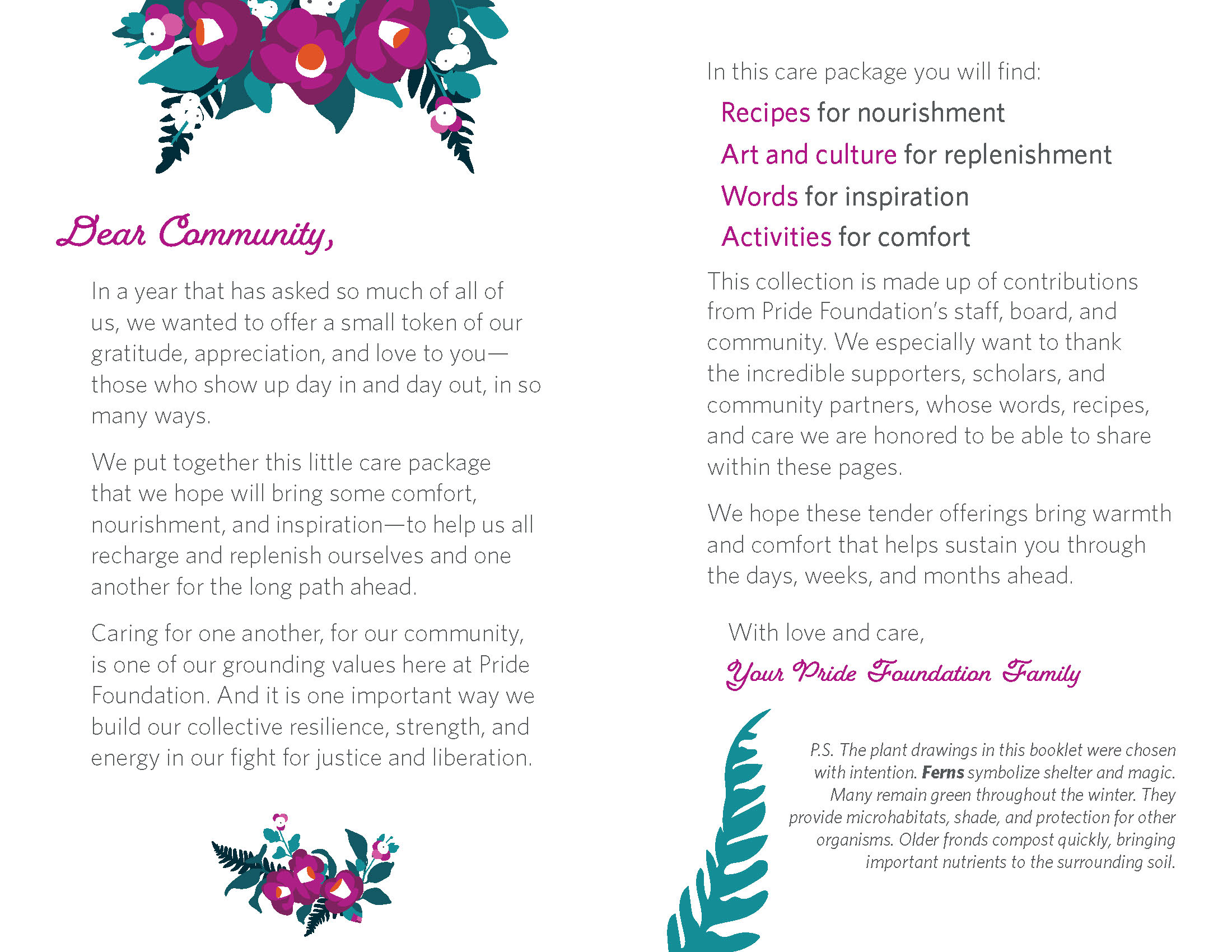 Community Care Package Excerpts from Pride Foundation’s “Community Care Package,” December 2020. Tagged digital art, lgbtqia, nonprofit, plants